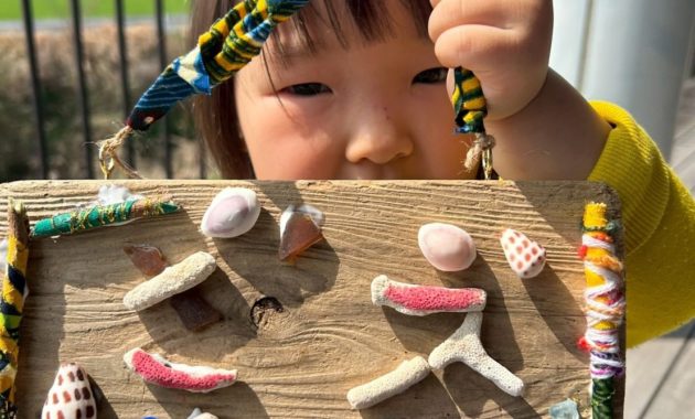 サンゴや貝殻などの海の恵みとアフリカの端切れなどを使って