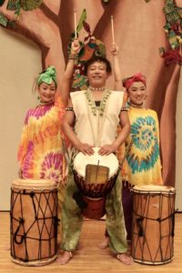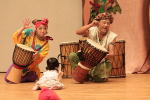 生まれてまもない子どもが、ひとりの観客として、親と一緒に本物の芸術に触れる機会を!という思いから◯△□ちゃんは生まれました。◯△□ちゃんは、0~3歳の乳幼児親子のためのセリフのないアフリカンパフォーマンスです。タイコのコトバは魔法の言葉。動物の革や木でできた自然素材の楽器が紡ぎ出す「生音」が、言葉が出る前の子どもたちに優しく語りかけ、やがてアフリカのリズムの世界へ誘います。