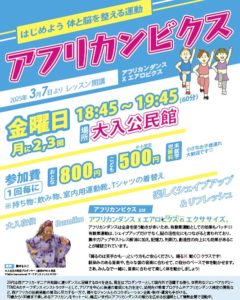 | Rumiko | アフリカンビクス | 18:45〜19:45 | 大入公民館 | 大人800円